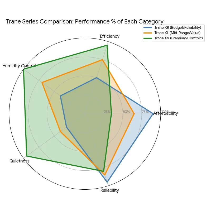 Trane XR costs the least. Trane XL offers balanced efficiency and comfort. Trane XV delivers the highest efficiency tier, best humidity control, the lowest sound level (dBA), and premium comfort features.